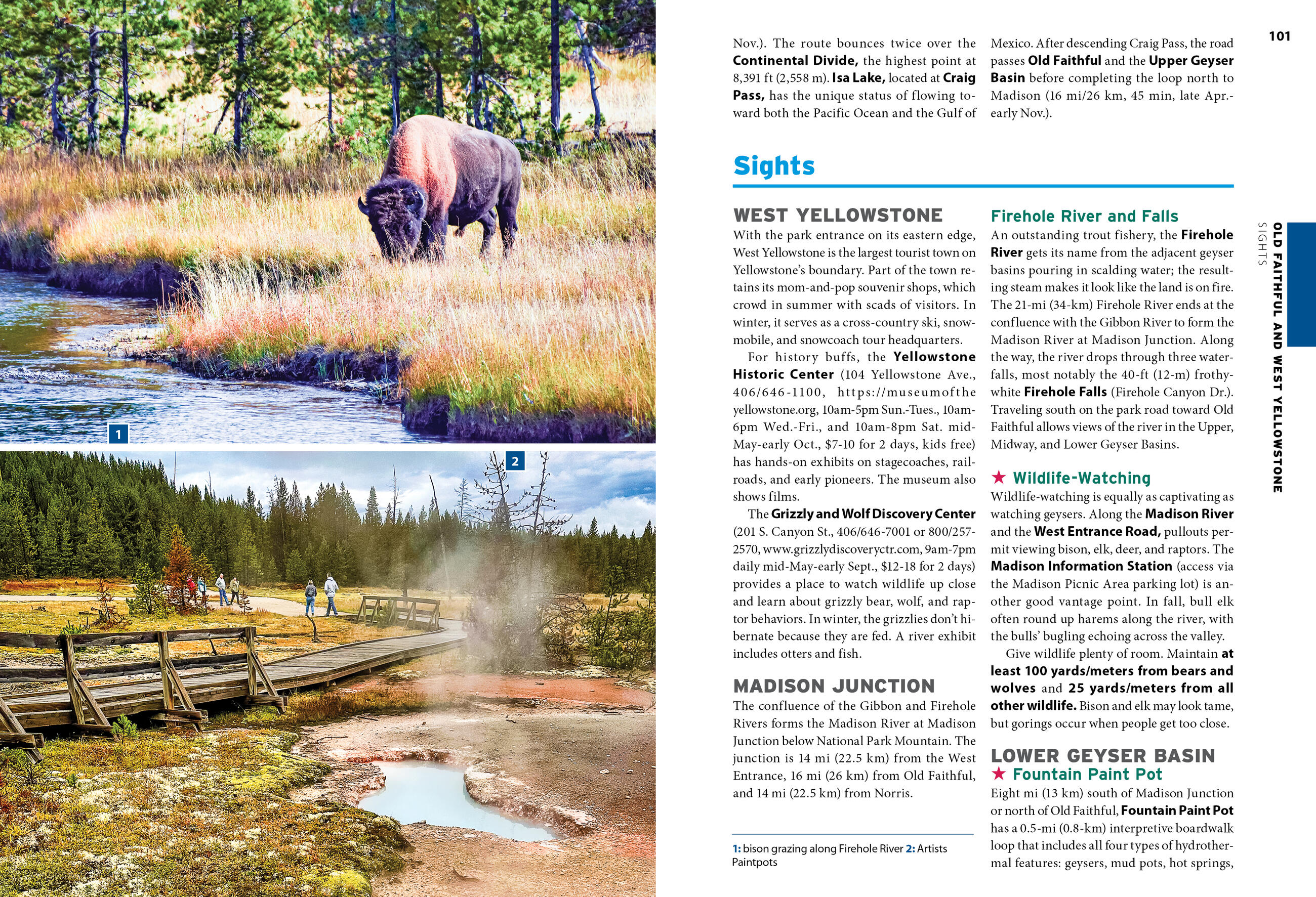 • Experience the outdoors: Marvel at the steam-spewing Old Faithful geyser or take a horseback ride to panoramic lakeside views. Hike through alpine forests to rushing waterfalls and catch a glimpse of wild bison, elk, wolves, or bears. Bask in the colorful radiance of Grand Prismatic Spring or stroll the boardwalks along Mammoth Hot Springs. Climb to Inspiration Point for breathtaking views of Jackson Hole and Jenny Lake, explore the quirky nearby towns, or discover the best spots to hit the slopes during the winter season